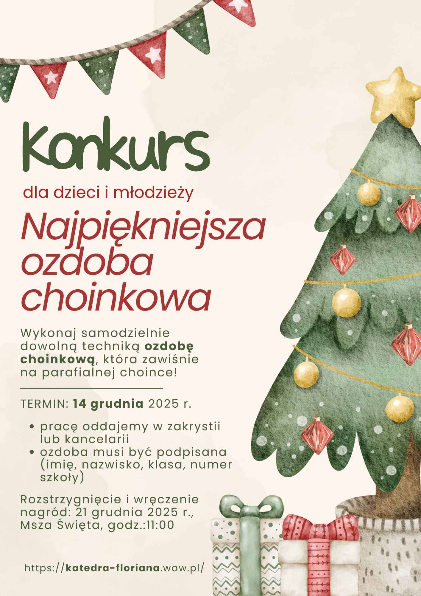 3. Dzieci i młodzież zachęcamy do wzięcia udziału w parafialnym konkursie na „najpiękniejszą ozdobę choinkową. Samodzielnie wykonaną i podpisaną ozdobę należy przynieść do zakrystii najpóźniej do 14 grudnia. Rozstrzygnięcie konkursu i wręczenie nagród 21 grudnia na Mszy Świętej o godz. 11.00.